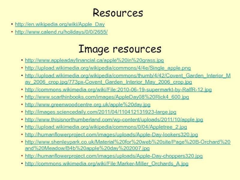 Image resourceshttp://www.appleadayfinancial.ca/apple%20in%20grass.jpghttp://upload.wikimedia.org/wikipedia/commons/4/4e/Single_apple.pnghttp://upload.wikimedia.org/wikipedia/commons/thumb/4/42/Covent_Garden_Interior_May_2006_crop.jpg/773px-Covent_Garden_Interior_May_2006_crop.jpghttp://commons.wikimedia.org/wiki/File:2010-06-19-supermarkt-by-RalfR-12.jpghttp://www.scarthinbooks.com/images/AppleDay08%20Rick4_600.jpghttp://www.greenwoodcentre.org.uk/apple%20day.jpghttp://images.sciencedaily.com/2011/04/110412131923-large.jpghttp://www.thisisnorthumberland.com/wp-content/uploads/2011/10/apple.jpghttp://upload.wikimedia.org/wikipedia/commons/0/04/Appletree_2.jpghttp://humanflowerproject.com/images/uploads/Apple-Day-lookers320.jpghttp://www.shenleypark.co.uk/Material%20for%20web%20site/Page%20B-Orchard%20and%20Meadow/B4b%20apple%20day%202007.jpghttp://humanflowerproject.com/images/uploads/Apple-Day-choppers320.jpghttp://commons.wikimedia.org/wiki/File:Marker-Miller_Orchards_A.jpg Resourceshttp://en.wikipedia.org/wiki/Apple_Dayhttp://www.calend.ru/holidays/0/0/2655/