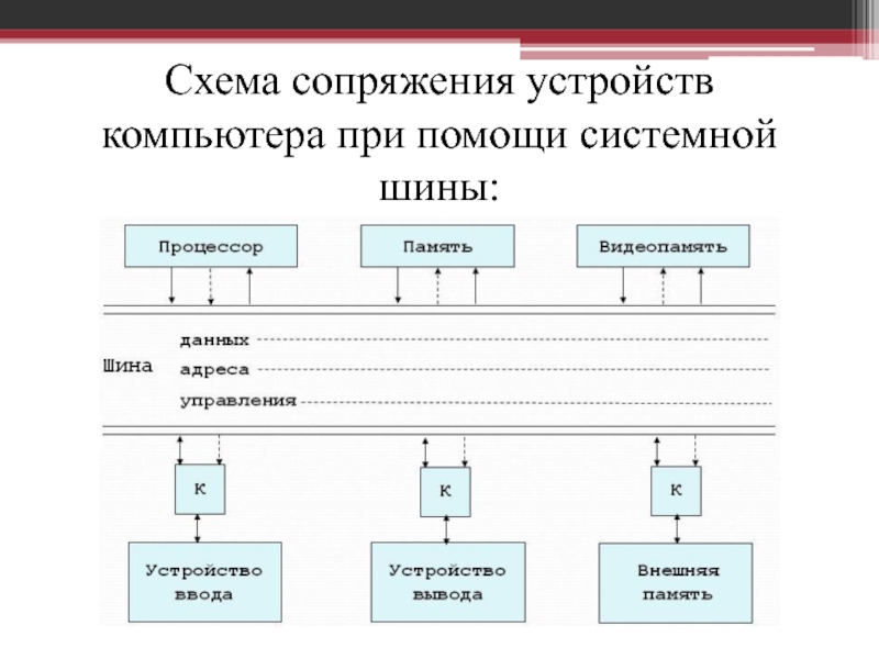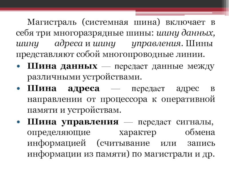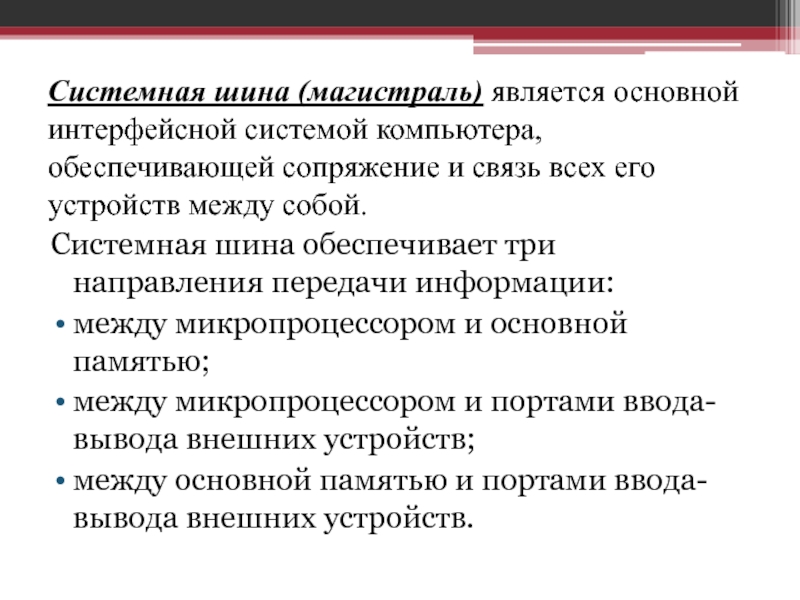 Системная шина (магистраль) является основной интерфейсной системой компьютера, обеспечивающей сопряжение и связь всех его устройств между собой.
