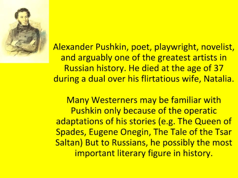 Many Westerners may be familiar with Pushkin only because of the operatic adaptations of his stories (e.g. The Queen of Spades, Eugene Onegin, The Tale of the Tsar Saltan) But to Russians, he possibly the most important literary figure in history.