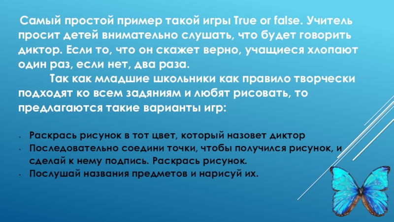 Слайд 17 Самый простой пример такой игры True or false. Учитель просит