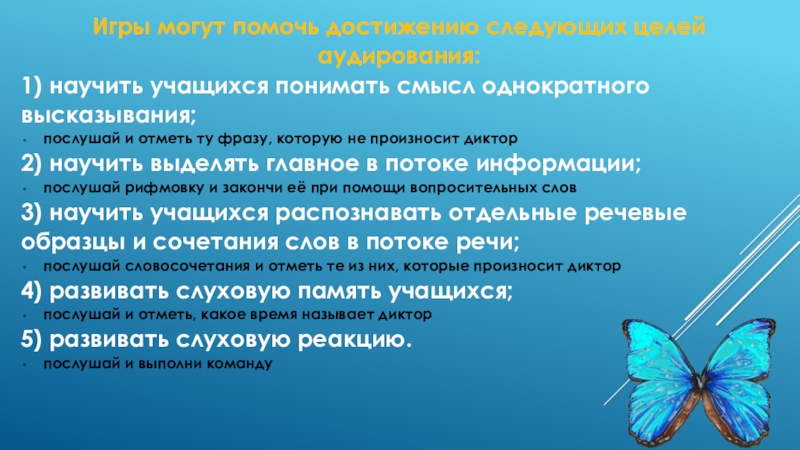 Слайд 16Игры могут помочь достижению следующих целей аудирования: