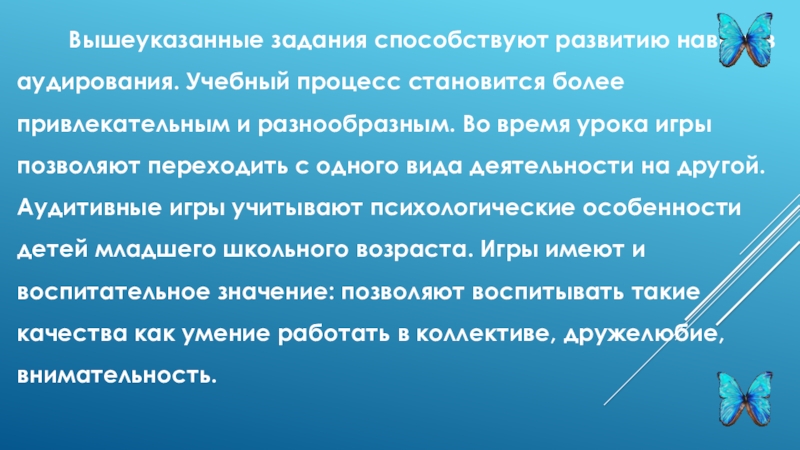 процесс становится более привлекательным и разнообразным. Во время урока игры позволяют переходить с одного вида деятельности на другой. Аудитивные игры учитывают психологические особенности детей младшего школьного возраста. Игры имеют и воспитательное значение: позволяют воспитывать такие качества как умение работать в коллективе, дружелюбие, внимательность.