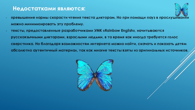 тексты, предоставленные разработчиками УМК «Rainbow English», начитываются русскоязычными дикторами, взрослыми людьми, в то время как иногда требуется голос сверстника. Но благодаря возможностям интернета можно найти, скачать и показать детям абсолютно аутентичный материал, так как многие тексты взяты из оригинальных источников.