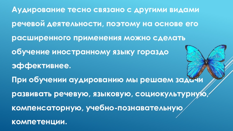 При обучении аудированию мы решаем задачи развивать речевую, языковую, социокультурную, компенсаторную, учебно-познавательную компетенции.