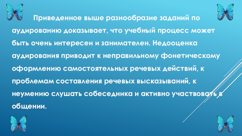 аудированию доказывает, что учебный процесс может быть очень интересен и занимателен. Недооценка аудирования приводит к неправильному фонетическому оформлению самостоятельных речевых действий, к проблемам составления речевых высказываний, к неумению слушать собеседника и активно участвовать в общении.