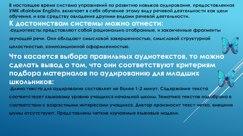 Длина текста для аудирования составляет не более 1-2 минут. Содержание текста соответствует языковому уровню учащихся начальной школы. Тематика текстов подобрана в соответствии с возрастными интересами учащихся. Диктор произносит текст четко, внешние шумы отсутствуют. Представлены четкие изучаемые языковые модели.