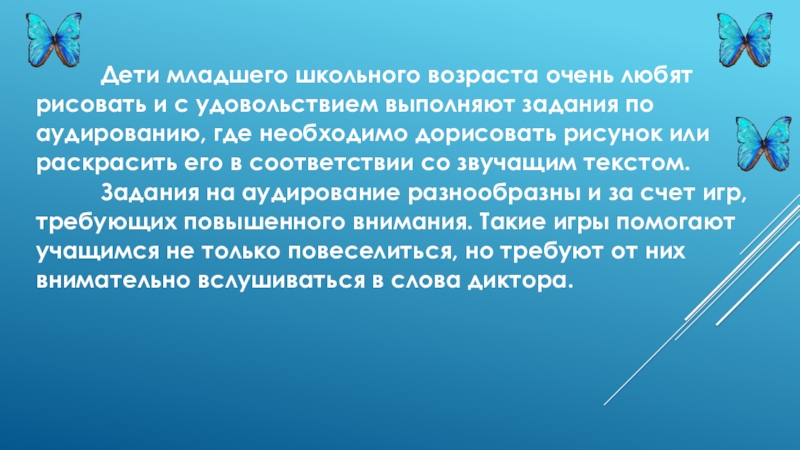 рисовать и с удовольствием выполняют задания по аудированию, где необходимо дорисовать рисунок или раскрасить его в соответствии со звучащим текстом.