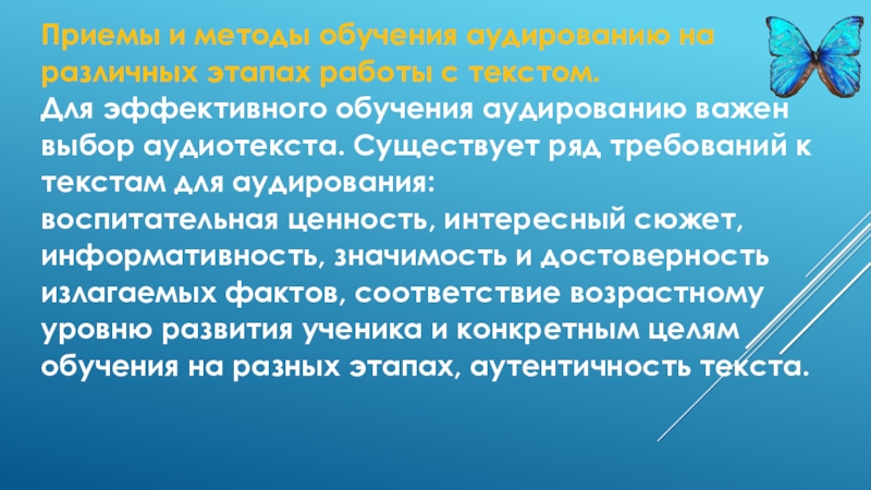 эффективного обучения аудированию важен выбор аудиотекста. Существует ряд требований к текстам для аудирования: