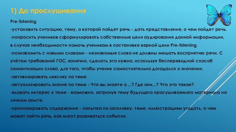 -попросить учеников сформулировать собственные цели аудирования данной информации, в случае необходимости помочь ученикам в постановке верной цели Pre-listening