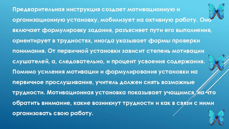 Она включает формулировку задания, разъясняет пути его выполнения, ориентирует в трудностях, иногда указывает формы проверки понимания. От первичной установки зависит степень мотивации слушателей, а, следовательно, и процент усвоения содержания. Помимо усиления мотивации и формулирования установки на первичное прослушивание, учитель должен снять возможные трудности. Мотивационная установка показывает учащимся, на что обратить внимание, какие возникнут трудности и как в связи с ними организовать свою работу.