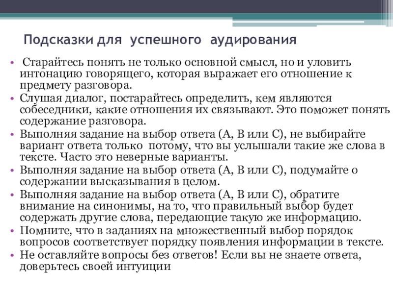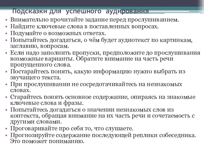Слайд 13Подсказки для успешного аудирования
