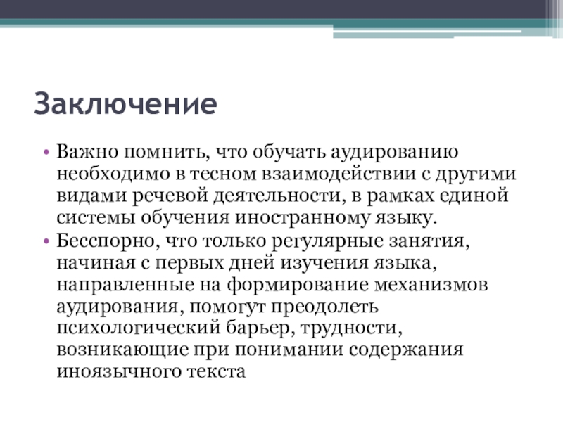 Бесспорно, что только регулярные занятия, начиная с первых дней изучения языка, направленные на формирование механизмов аудирования, помогут преодолеть психологический барьер, трудности, возникающие при понимании содержания иноязычного текста