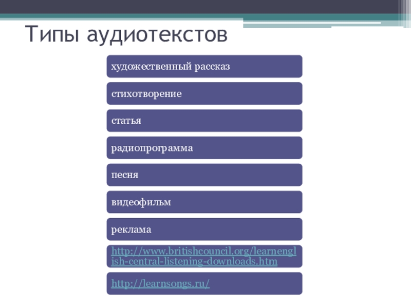 Слайд 5Типы аудиотекстов