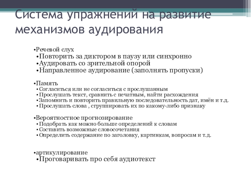 Слайд 7Система упражнений на развитие механизмов аудирования