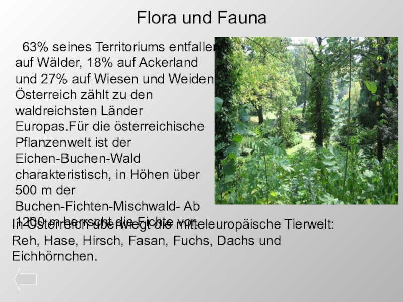 Wälder, 18% auf Ackerland und 27% auf Wiesen und Weiden.Österreich zählt zu den waldreichsten Länder Europas.Für die österreichische Pflanzenwelt ist der Eichen-Buchen-Wald charakteristisch, in Höhen über 500 m der Buchen-Fichten-Mischwald- Ab 1200 m herrscht die Fichte vor.