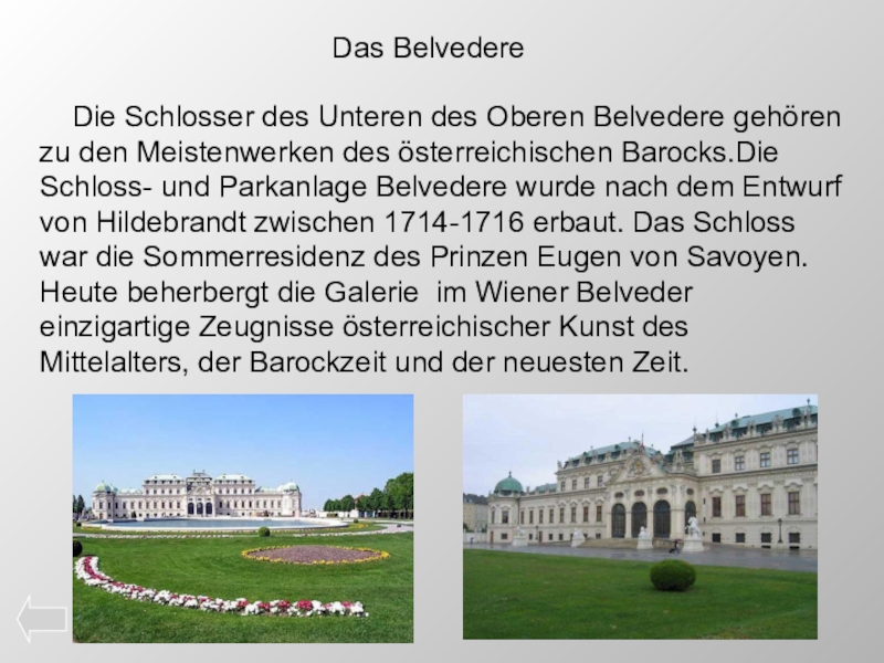 zu den Meistenwerken des österreichischen Barocks.Die Schloss- und Parkanlage Belvedere wurde nach dem Entwurf von Hildebrandt zwischen 1714-1716 erbaut. Das Schloss war die Sommerresidenz des Prinzen Eugen von Savoyen. Heute beherbergt die Galerie im Wiener Belveder einzigartige Zeugnisse österreichischer Kunst des Mittelalters, der Barockzeit und der neuesten Zeit.