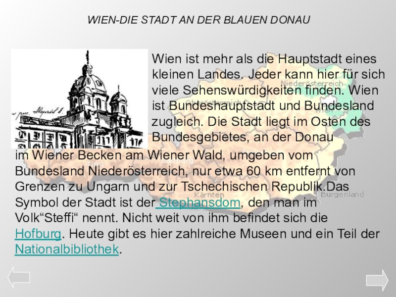 im Wiener Becken am Wiener Wald, umgeben vom Bundesland Niederösterreich, nur etwa 60 km entfernt von Grenzen zu Ungarn und zur Tschechischen Republik.Das Symbol der Stadt ist der Stephansdom, den man im Volk“Steffi“ nennt. Nicht weit von ihm befindet sich die Hofburg. Heute gibt es hier zahlreiche Museen und ein Teil der Nationalbibliothek.