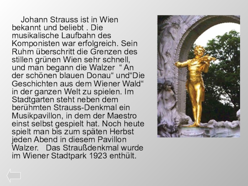 beliebt . Die musikalische Laufbahn des Komponisten war erfolgreich. Sein Ruhm überschritt die Grenzen des stillen grünen Wien sehr schnell, und man begann die Walzer “ An der schönen blauen Donau“ und“Die Geschichten aus dem Wiener Wald“ in der ganzen Welt zu spielen. Im Stadtgarten steht neben dem berühmten Strauss-Denkmal ein Musikpavillon, in dem der Maestro einst selbst gespielt hat. Noch heute spielt man bis zum späten Herbst jeden Abend in diesem Pavillon Walzer. Das Straußdenkmal wurde im Wiener Stadtpark 1923 enthült.