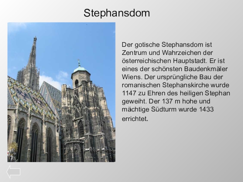 ist eines der schönsten Baudenkmäler Wiens. Der ursprüngliche Bau der romanischen Stephanskirche wurde 1147 zu Ehren des heiligen Stephan geweiht. Der 137 m hohe und mächtige Südturm wurde 1433 errichtet.