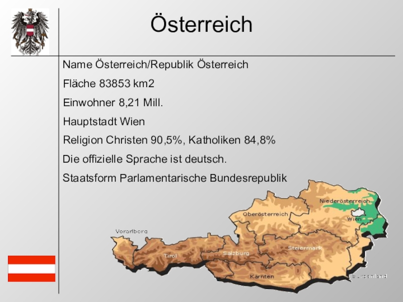 an den Ostalpen und ist dem Mittelmeerraum benachbart. Mit sieben Staaten hat Österreich gemeinsame Grenzen: mit Deutschland, mit der Tschechischen Republik, mit Ungarn, Slowenien, Italien, der Schweiz und Lichtenstein. Österreich besteht als Bundesstaat aus neun Bundesländern: Burgenland, Kärnten, Niederösterreich,