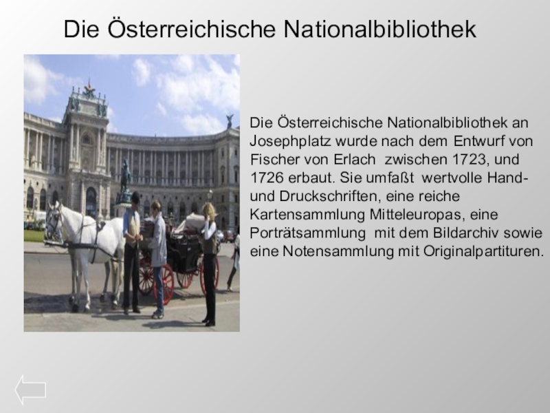 Entwurf von Fischer von Erlach zwischen 1723, und 1726 erbaut. Sie umfaßt wertvolle Hand- und Druckschriften, eine reiche Kartensammlung Mitteleuropas, eine Porträtsammlung mit dem Bildarchiv sowie eine Notensammlung mit Originalpartituren.