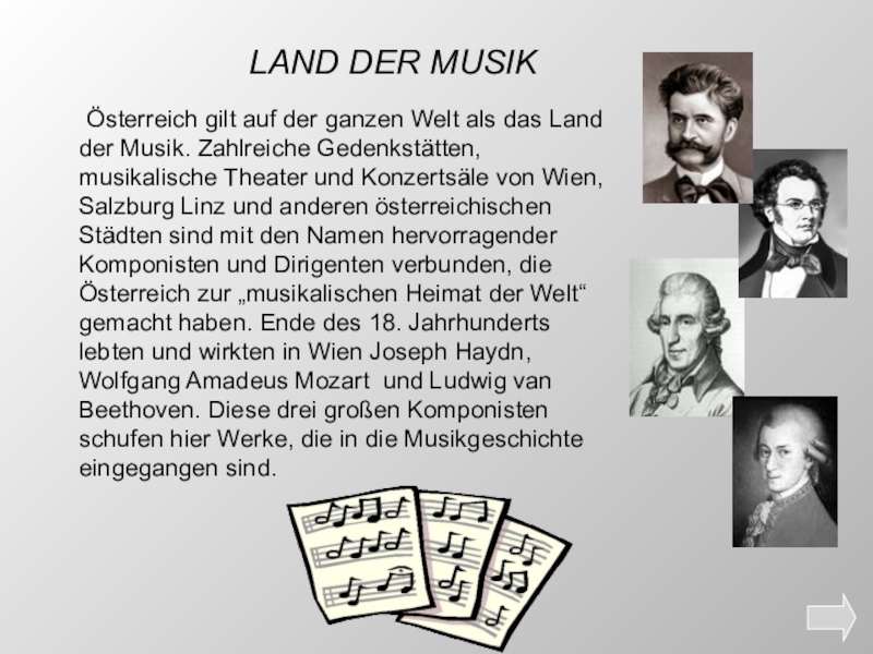 Welt als das Land der Musik. Zahlreiche Gedenkstätten, musikalische Theater und Konzertsäle von Wien, Salzburg Linz und anderen österreichischen Städten sind mit den Namen hervorragender Komponisten und Dirigenten verbunden, die Österreich zur „musikalischen Heimat der Welt“ gemacht haben. Ende des 18. Jahrhunderts lebten und wirkten in Wien Joseph Haydn, Wolfgang Amadeus Mozart und Ludwig van Beethoven. Diese drei großen Komponisten schufen hier Werke, die in die Musikgeschichte eingegangen sind.
