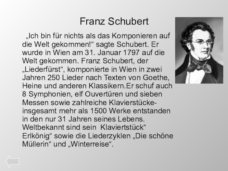 auf die Welt gekommen!“ sagte Schubert. Er wurde in Wien am 31. Januar 1797 auf die Welt gekommen. Franz Schubert, der „Liederfürst“, komponierte in Wien in zwei Jahren 250 Lieder nach Texten von Goethe, Heine und anderen Klassikern.Er schuf auch 8 Symphonien, elf Ouvertüren und sieben Messen sowie zahlreiche Klavierstücke- insgesamt mehr als 1500 Werke entstanden in den nur 31 Jahren seines Lebens. Weltbekannt sind sein Klaviertstück“ Erlkönig“ sowie die Liederzyklen „Die schöne Müllerin“ und „Winterreise“.