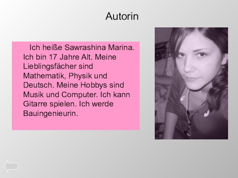 Jahre Alt. Meine Lieblingsfächer sind Mathematik, Physik und Deutsch. Meine Hobbys sind Musik und Computer. Ich kann Gitarre spielen. Ich werde Bauingenieurin.