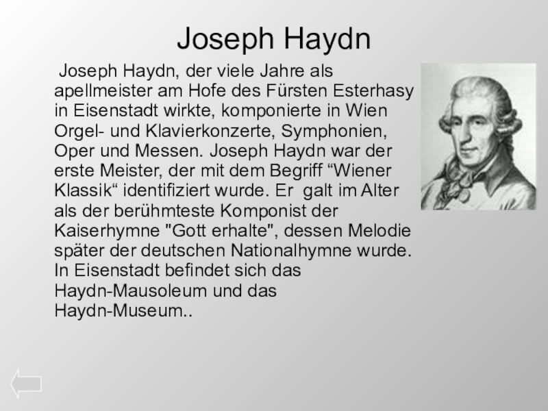am Hofe des Fürsten Esterhasy in Eisenstadt wirkte, komponierte in Wien Orgel- und Klavierkonzerte, Symphonien, Oper und Messen. Joseph Haydn war der erste Meister, der mit dem Begriff “Wiener Klassik“ identifiziert wurde. Er galt im Alter als der berühmteste Komponist der Kaiserhymne "Gott erhalte", dessen Melodie später der deutschen Nationalhymne wurde. In Eisenstadt befindet sich das Haydn-Mausoleum und das Haydn-Museum..