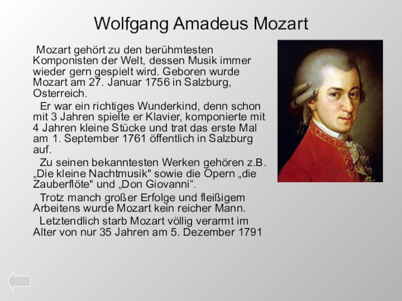 Zu seinen bekanntesten Werken gehören z.B. „Die kleine Nachtmusik" sowie die Opern „die Zauberflöte" und „Don Giovanni“.