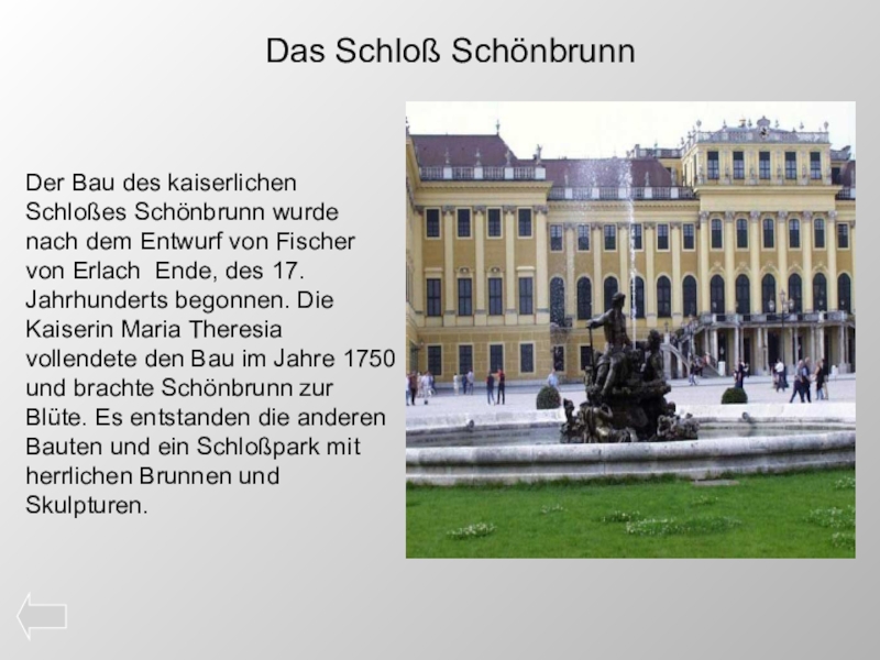 dem Entwurf von Fischer von Erlach Ende, des 17. Jahrhunderts begonnen. Die Kaiserin Maria Theresia vollendete den Bau im Jahre 1750 und brachte Schönbrunn zur Blüte. Es entstanden die anderen Bauten und ein Schloßpark mit herrlichen Brunnen und Skulpturen.
