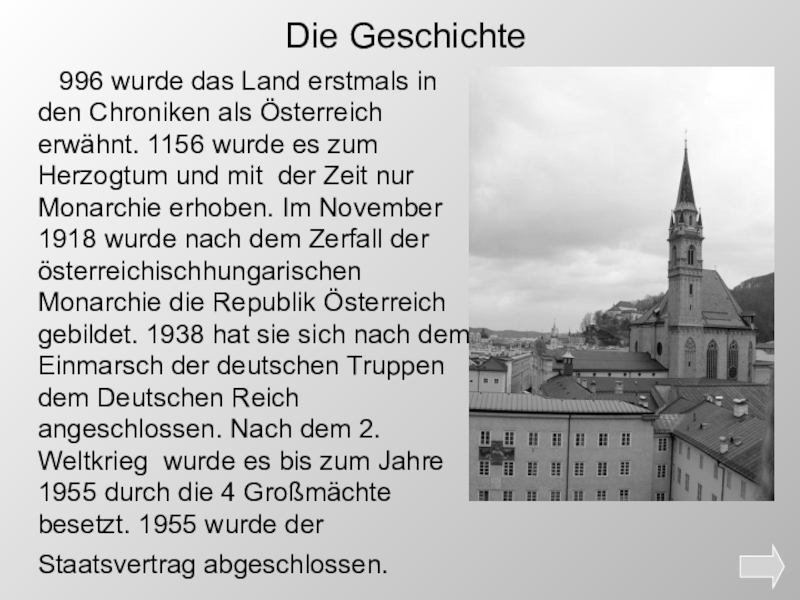Chroniken als Österreich erwähnt. 1156 wurde es zum Herzogtum und mit der Zeit nur Monarchie erhoben. Im November 1918 wurde nach dem Zerfall der österreichischhungarischen Monarchie die Republik Österreich gebildet. 1938 hat sie sich nach dem Einmarsch der deutschen Truppen dem Deutschen Reich angeschlossen. Nach dem 2. Weltkrieg wurde es bis zum Jahre 1955 durch die 4 Großmächte besetzt. 1955 wurde der Staatsvertrag abgeschlossen.