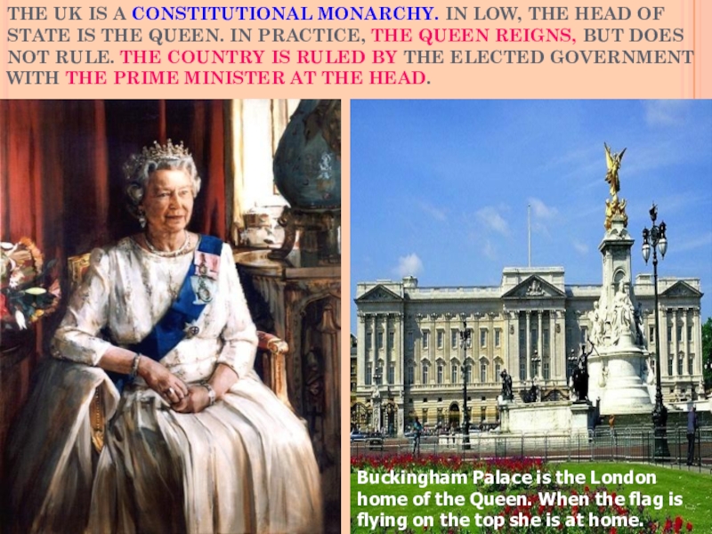 Buckingham Palace is the London home of the Queen. When the flag is flying on the top she is at home.