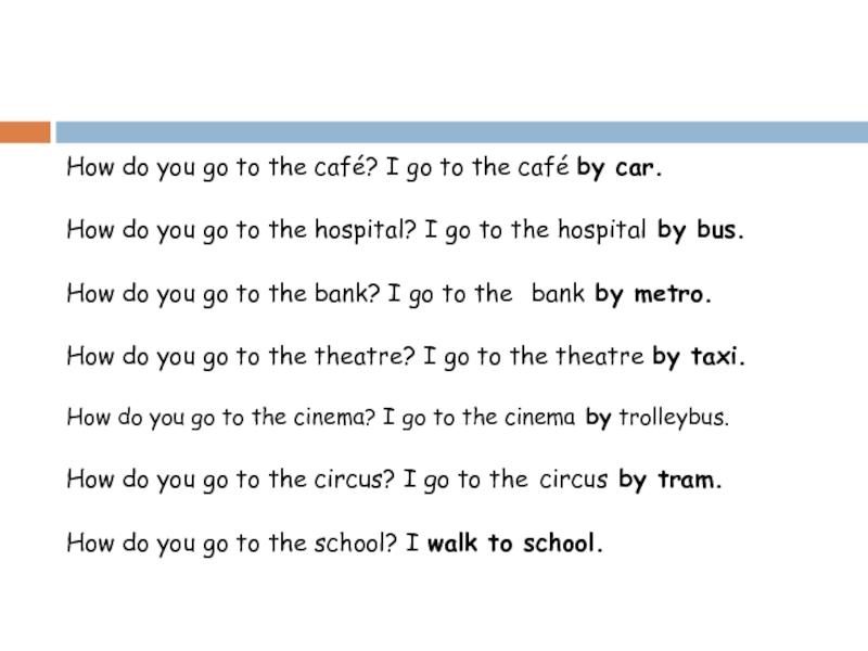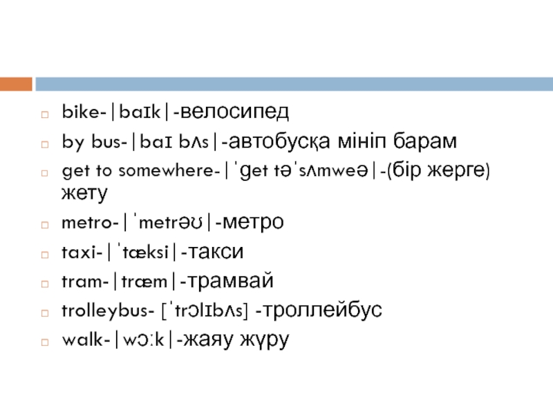 bike-|baɪk|-велосипедby bus-|baɪ bʌs|-автобусқа мініп барамget to somewhere-|ˈɡet təˈsʌmweə|-(бір жерге) жетуmetro-|ˈmetrəʊ|-метроtaxi-|ˈtæksi|-таксиtram-|træm|-трамвайtrolleybus- [ˈtrɔlɪbʌs] -троллейбусwalk-|wɔːk|-жаяу жүру