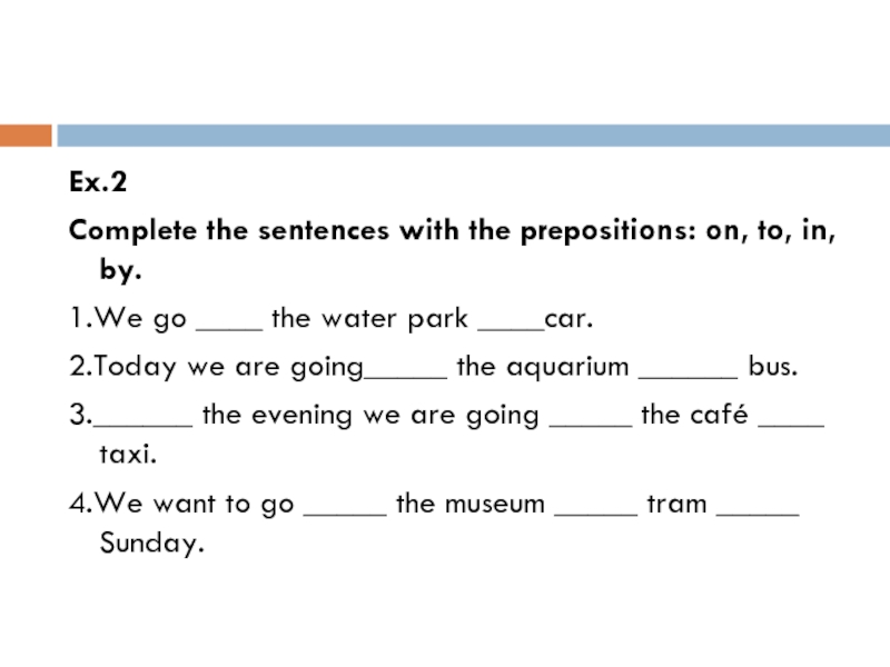 Ex.2Complete the sentences with the prepositions: on, to, in, by.1.We go ____ the water park ____car.2.Today we