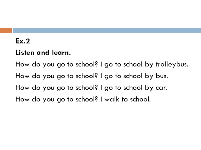 Ex.2Listen and learn.How do you go to school? I go to school by trolleybus.How do you go