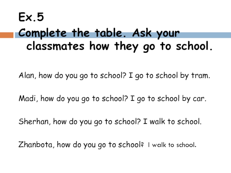 Ex.5Complete the table. Ask your classmates how they go to school.Alan, how do you go to school?