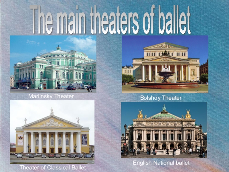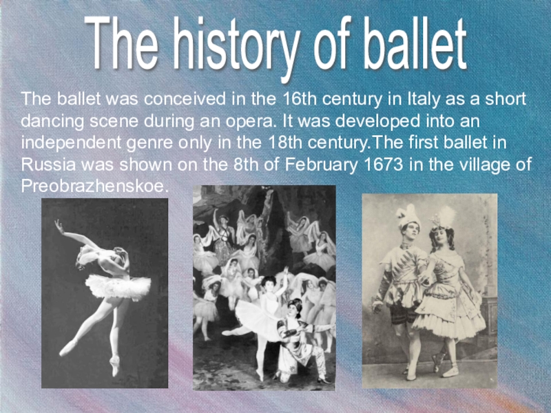 The ballet was conceived in the 16th century in Italy as a short dancing scene during an opera. It was developed into an independent genre only in the 18th century.The first ballet in Russia was shown on the 8th of February 1673 in the village of Preobrazhenskoe.