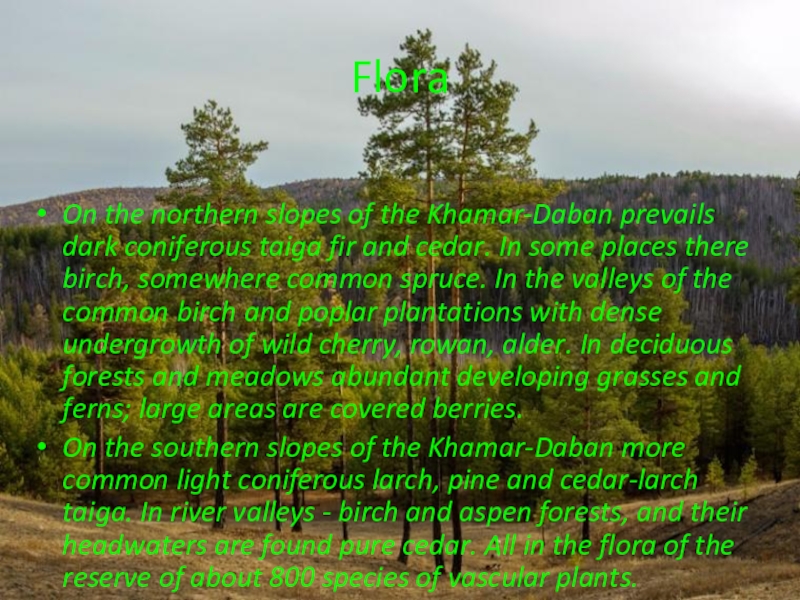 On the southern slopes of the Khamar-Daban more common light coniferous larch, pine and cedar-larch taiga. In river valleys - birch and aspen forests, and their headwaters are found pure cedar. All in the flora of the reserve of about 800 species of vascular plants.
