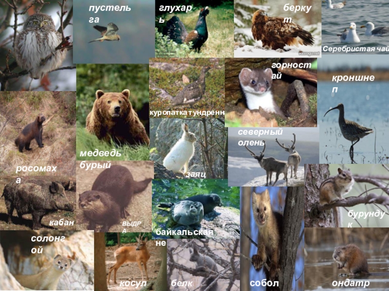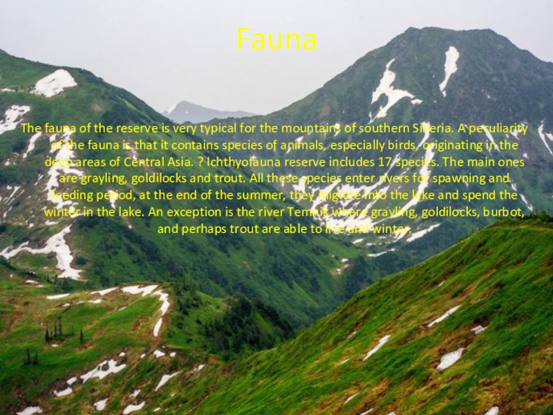 of southern Siberia. A peculiarity of the fauna is that it contains species of animals, especially birds, originating in the deep areas of Central Asia. ? Ichthyofauna reserve includes 17 species. The main ones are grayling, goldilocks and trout. All these species enter rivers for spawning and feeding period, at the end of the summer, they migrate into the lake and spend the winter in the lake. An exception is the river Temnik where grayling, goldilocks, burbot, and perhaps trout are able to live and winter.