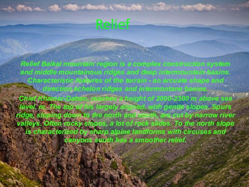 Chief Khamar-Daban, reaches a height of 2000-2300 m above sea level. m. The top of his largely aligned, with gentle slopes. Spurs ridge, sloping down to the north and south, are cut by narrow river valleys. Often rocky slopes, a lot of rock slides. To the north slope is characterized by sharp alpine landforms with circuses and canyons south has a smoother relief.