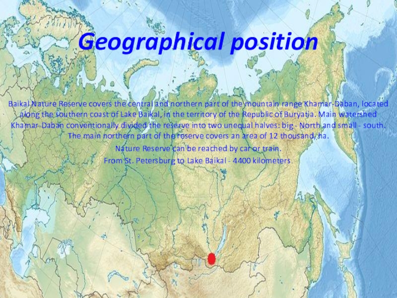 the mountain range Khamar-Daban, located along the southern coast of Lake Baikal, in the territory of the Republic of Buryatia. Main watershed Khamar-Daban conventionally divided the reserve into two unequal halves: big - North and small - south. The main northern part of the reserve covers an area of 12 thousand, ha.