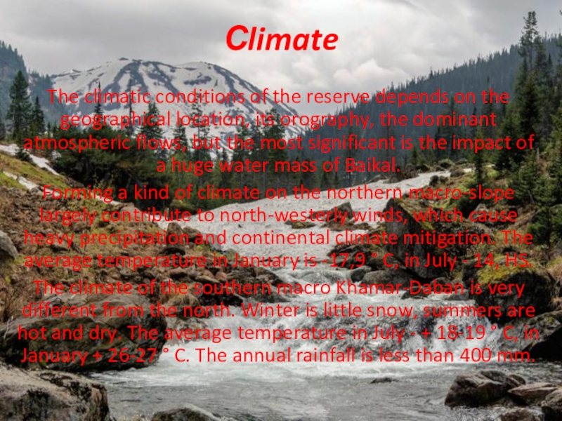 The climate of the southern macro Khamar-Daban is very different from the north. Winter is little snow, summers are hot and dry. The average temperature in July - + 18-19 ° C, in January + 26-27 ° C. The annual rainfall is less than 400 mm.