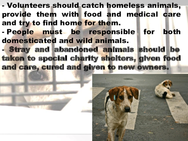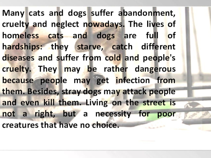 lives of homeless cats and dogs are full of hardships: they starve, catch different diseases and suffer from cold and people's cruelty. They may be rather dangerous because people may get infection from them. Besides, stray dogs may attack people and even kill them. Living on the street is not a right, but a necessity for poor creatures that have no choice.