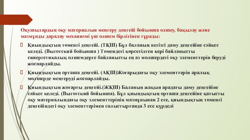 Слайд 9Оқушылардың оқу материалын меңгеру деңгейі бойынша өлшеу, бақылау және мазмұнды даралау