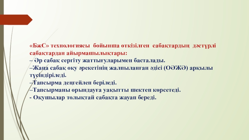 «БжС» технологиясы  бойынша өткізілген  сабақтардың  дәстүрлі сабақтардан айырмашылықтары:  – Әр сабақ сергіту жаттығуларымен басталады. –Жаңа сабақ оқу