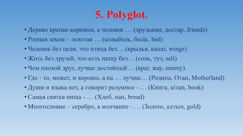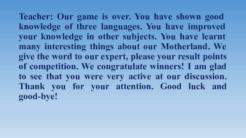 three languages. You have improved your knowledge in other subjects. You have learnt many interesting things about our Motherland. We give the word to our expert, please your result points of competition. We congratulate winners! I am glad to see that you were very active at our discussion. Thank you for your attention. Good luck and good-byе!