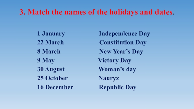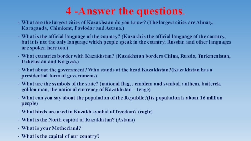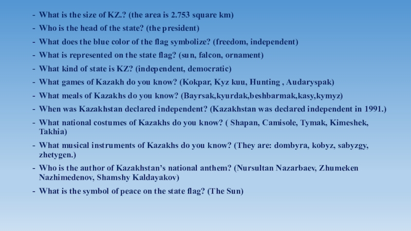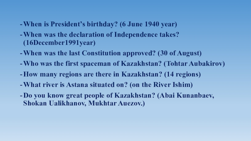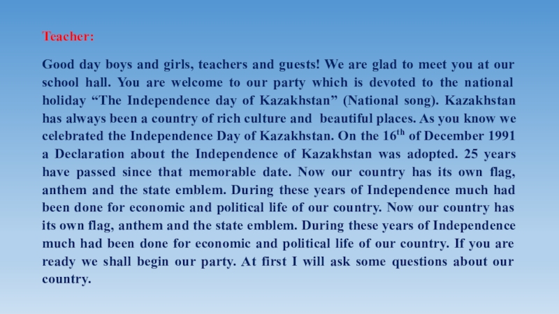 glad to meet you at our school hall. You are welcome to our party which is devoted to the national holiday “The Independence day of Kazakhstan” (National song). Kazakhstan has always been a country of rich culture and beautiful places. As you know we celebrated the Independence Day of Kazakhstan. On the 16th of December 1991 a Declaration about the Independence of Kazakhstan was adopted. 25 years have passed since that memorable date. Now our country has its own flag, anthem and the state emblem. During these years of Independence much had been done for economic and political life of our country. Now our country has its own flag, anthem and the state emblem. During these years of Independence much had been done for economic and political life of our country. If you are ready we shall begin our party. At first I will ask some questions about our country.