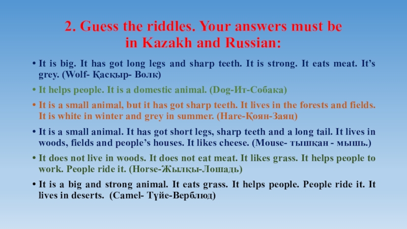 It does not live in woods. It does not eat meat. It likes grass. It helps people to work. People ride it. (Horse-Жылқы-Лошадь)