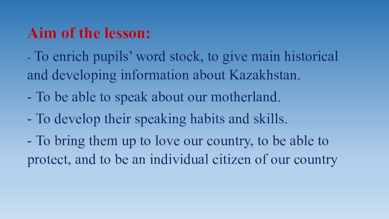 Teacher: What association do you have with the word “Kazakhstan ”. What does it mean the word “Motherland”? Who tells me? (audience activity)